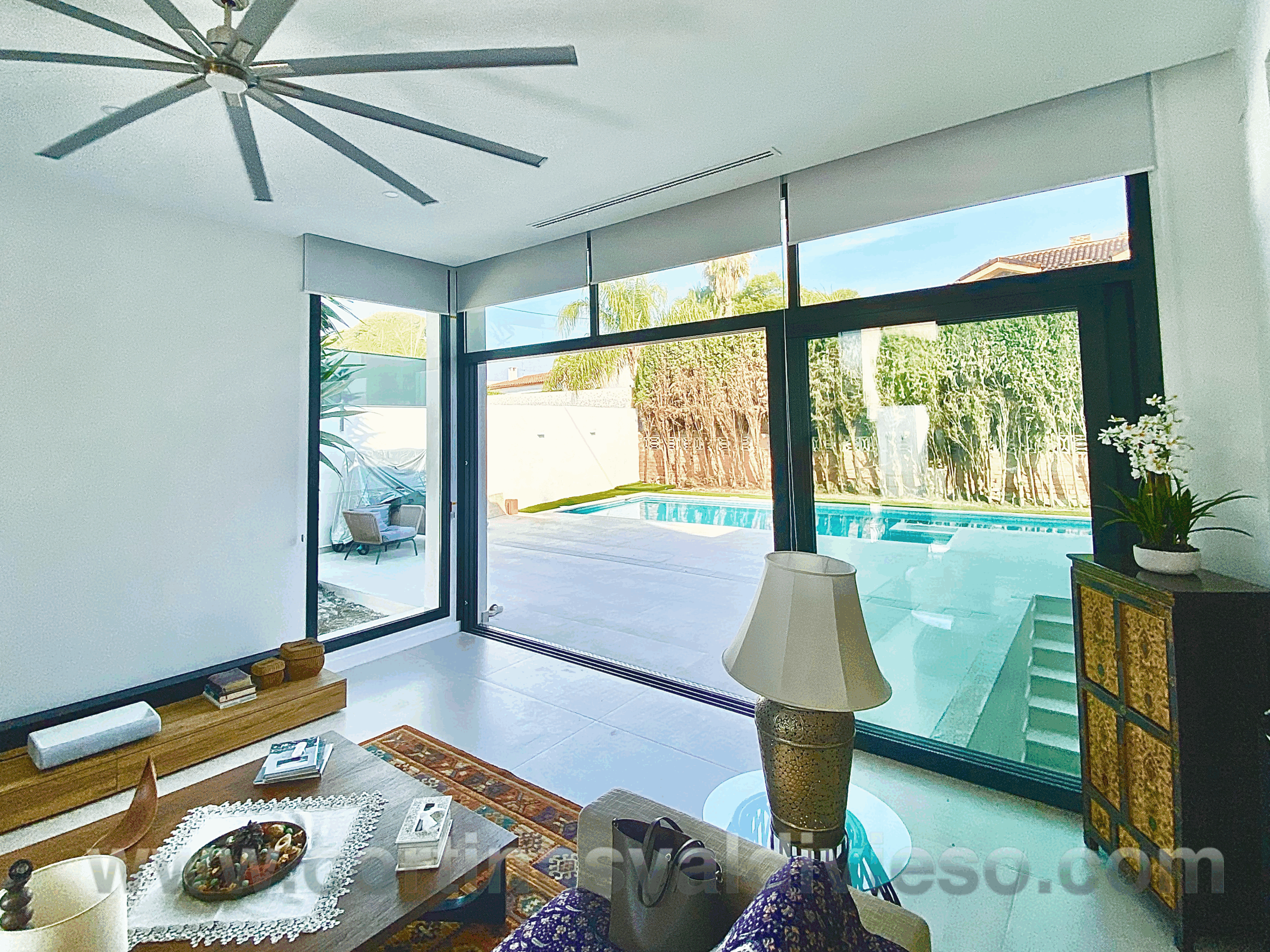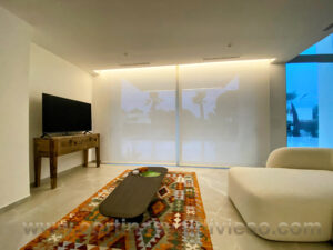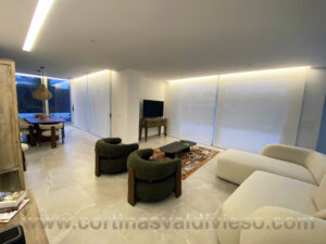 Estores enrollables de Screen con un grado de apertura del 5% que garantiza una total visibilidad exterior y una eficiente protección solar en el interior. Estores con Motor y mando via radio de Somfy.
